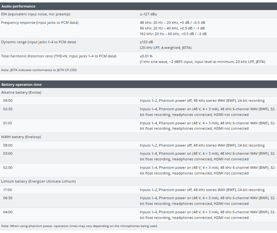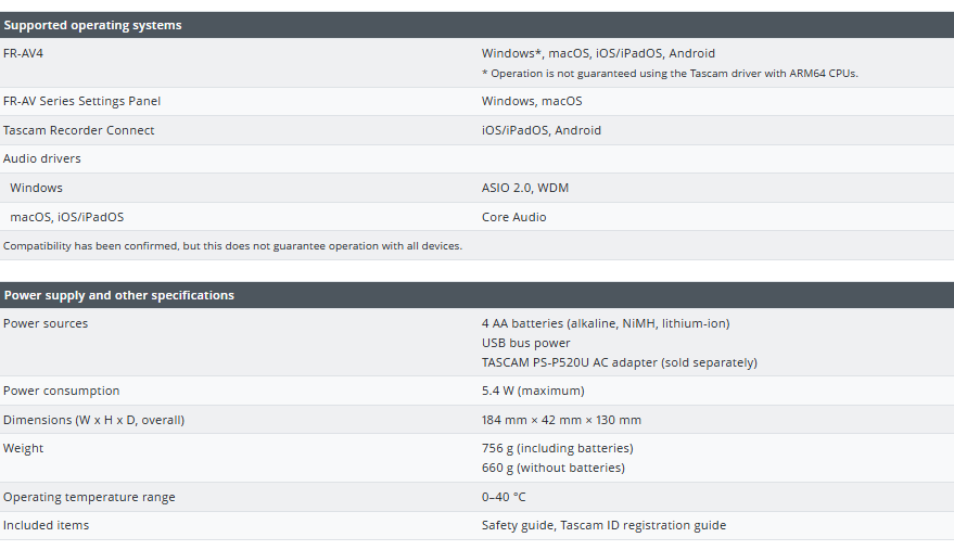 Technical specifications Tascam FR-AV4 Audio recorder: